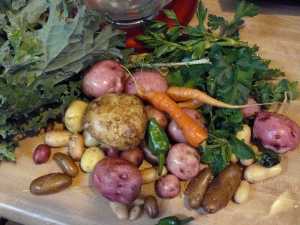 Last time I attempted the 100-yard diet, it got pretty ugly. Maybe because it was July, sort of an awkward month, while February in Oakland is time for spring greens and potatoes and carrots and beets AND the winter stores of winter squash and canned tomatoes haven’t run out. I haven’t had to resort to the corn cobs on the mantle, but I’m waiting until day 10 or so. Here’s what I ate for dinner.