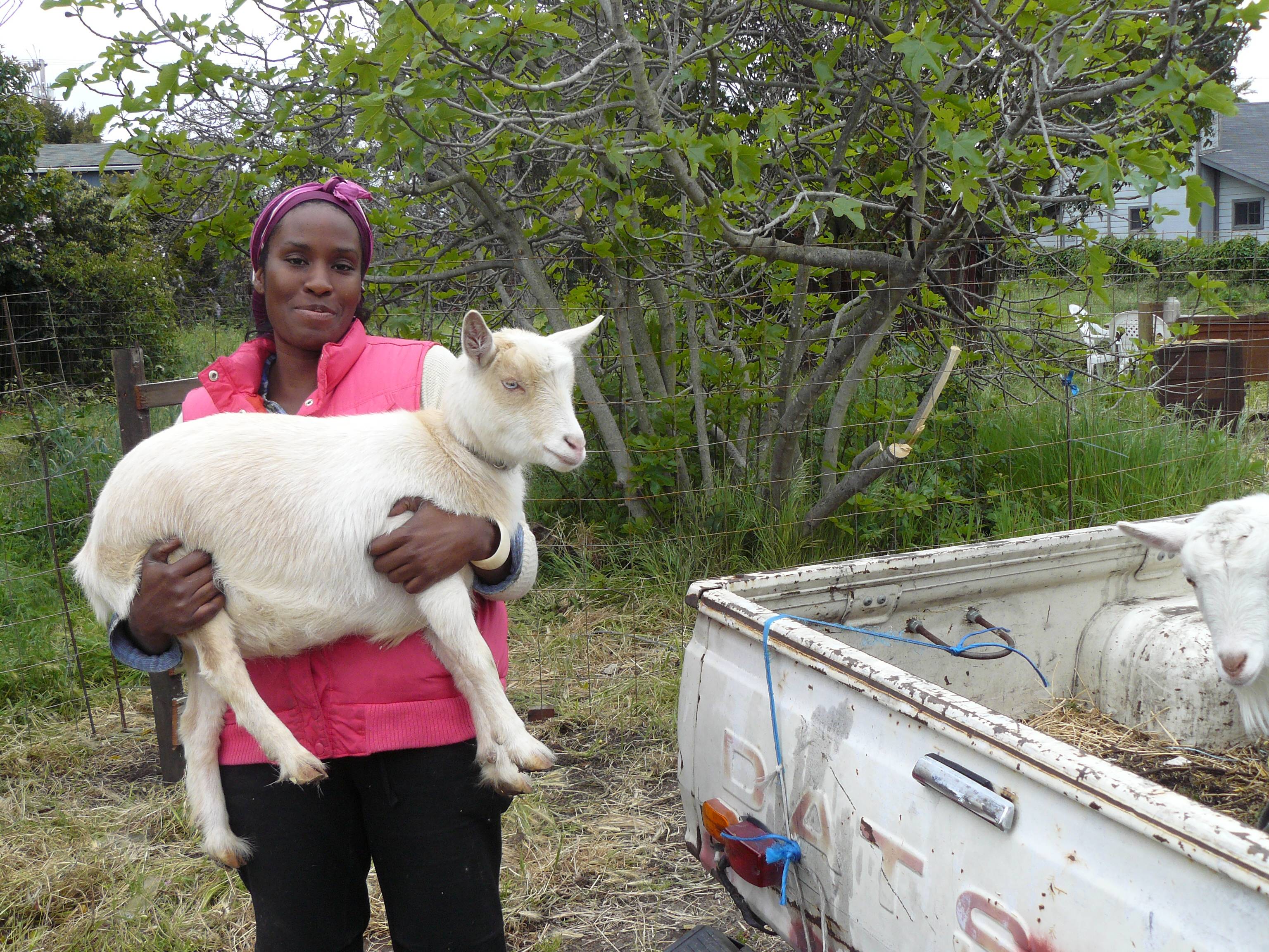 Last Tuesday I took Bebe and Ginger the goats to a gorgeous goat farm in Vacaville called Castle Rock. I popped them into a big dog crate and drove north. The scenery was gorgeous–green rolling hills, a farm with a bunch of white geese, old crumbling barns. My friends S and J came along because they were interested in goat breeding. Yep, Ginger and Bebe are getting knocked up. We released them out into the pack, and Bebe immediately began head butting everyone. Ginger puffed up. Establishing their rank in the herd. I think they’ll have a nice vacation. I mean, there are six bucks to choose from. The owner, Sarah, and I decided to hook Bebe up with a young buck named Harvey; and Ginger up with a dark and handsome Guy Noir. They’ll stay up there for about two weeks. For days after dropping them off, I thought I could hear them shifting around on the back porch, or nickering at night, begging for some oats. Just my imagination.