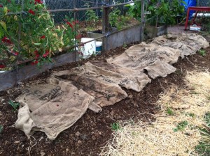 By June, when the rains have ceased, I’ll harvest the rest of the carrots, the potatoes, let the garlic dry up and then yank it. By July the only thing I’ll need to water are the fruit trees. I’ll cover everything with mulch or burlap bags.
