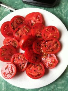 The skins are very sturdy (don’t want to say tough) and inside is the sweetest, juiciest yum sweet tomato. This is a plate of them with black sea salt from that new cool spice shop called the Oakland Spice Shop on Grand. They are also very good to can, as they hold their texture and don’t go all wobbly in the jar.