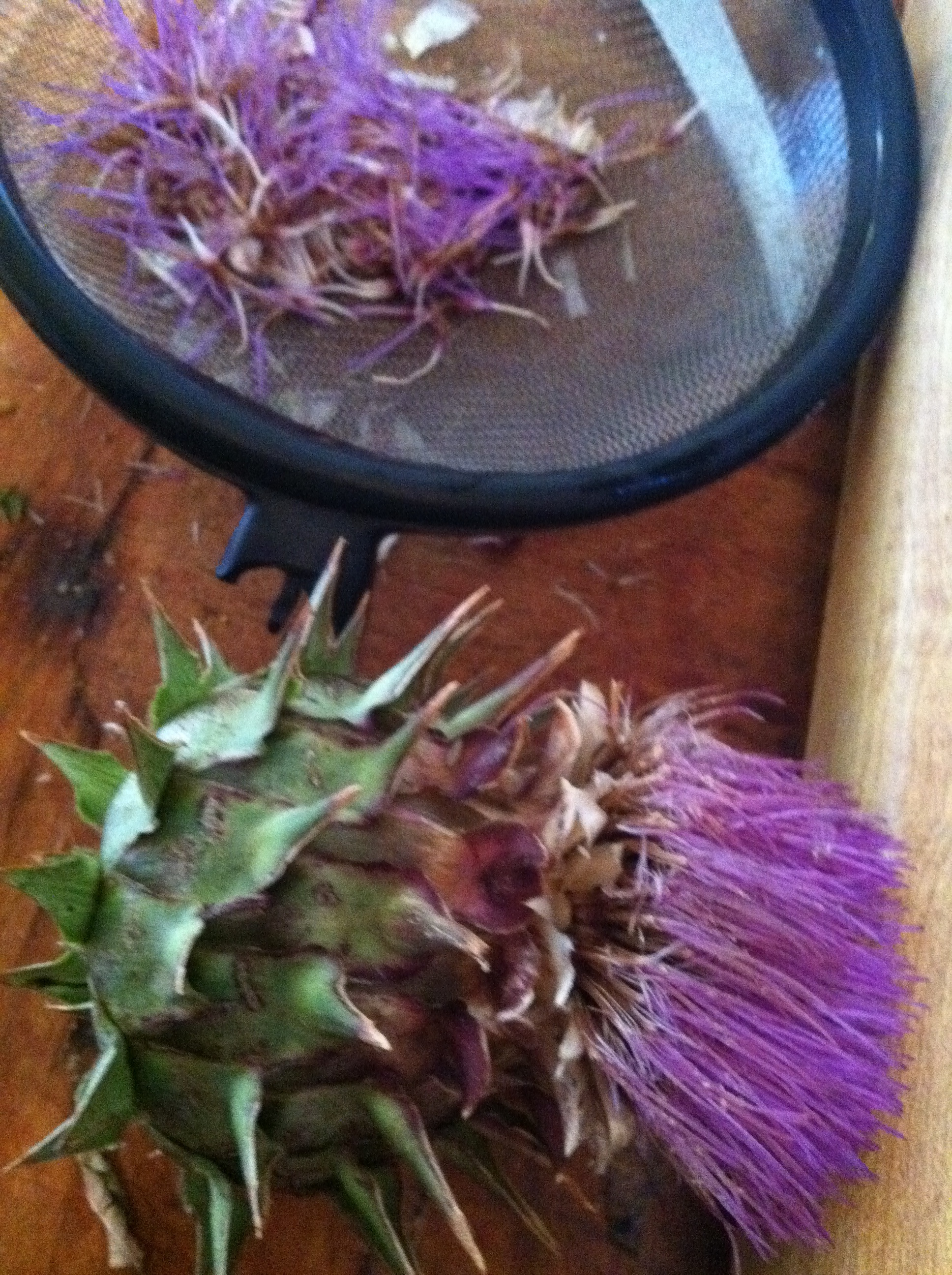 One of the sidebars in the book is about making rennet out of cardoons. I happen to have a lot of cardoons (they are pretty but weedy), so I was eager to try making my own vegetarian rennet (I once made my own rennet from a goat’s stomach, and it took forever…). First I picked the cardoons when they had bloomed and were purple.