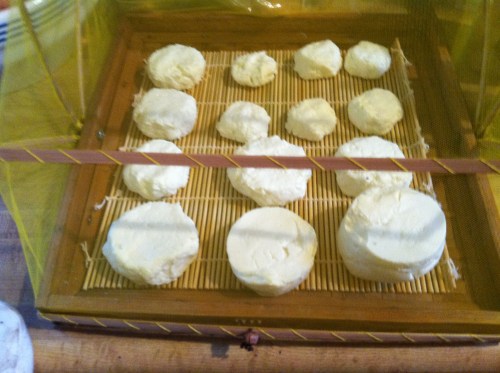 Maybe it’s the book, maybe it was the small amount of cardoon–but this cheese turned out better than any I’ve ever made. It’s super creamy and yum. I innoculated with some geotrichium, so the ones allowed to age will form a nice bloomy rind. Thanks Gianaclis!! And to D’s goats who provided the milk.