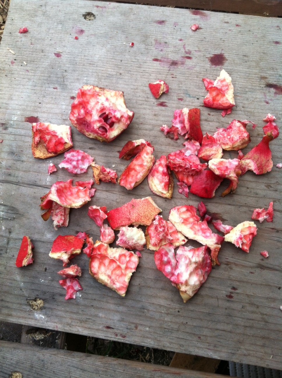 They started to explode on the shrub/tree I planted years ago. My first good crop of Wonderful Pomegranates. I had thought: they’ll never ripen here.