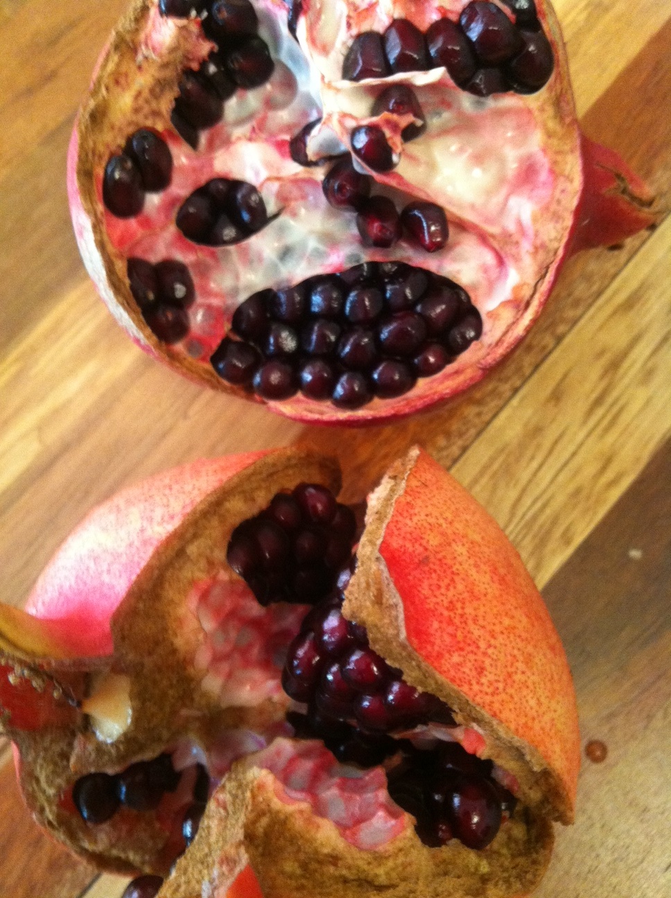 Sadly, Frannie and I ate all the poms fresh. Next year I’m hoping the pomegranate tree will have biggered itself and I’ll have enough to try the recipe…But if you find yourself with an overabundance, give it a shot. Any other good pom recipes out there?