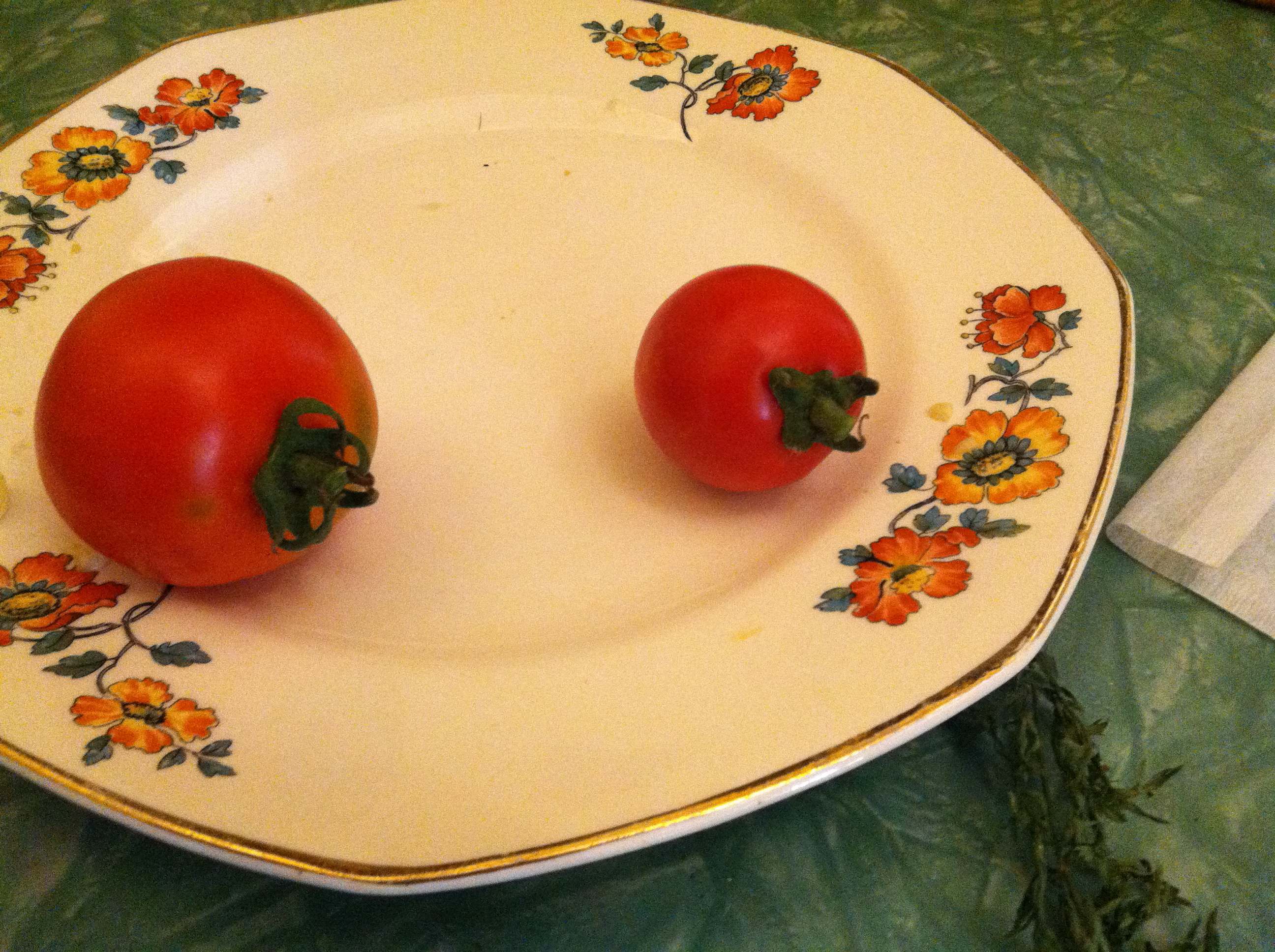 In 2005 Monsanto, the agro-company that makes Round-up, bought Seminis, a seed company that was the breeder of a beloved tomato called Early Girl. In California, Early Girls were “dry-farmed”, which produced an amazing flavor bomb that I loved to can away for the winter. But many farmers don’t want to buy anything from Monsanto. So, Joe Schirmer, of Dirty Girl Farm in Santa Cruz spent the last 5 years stablizing the hybrid. And now: I present The Dirty Girl. I planted four of these and four of the Early Girl. The Early Girl is the bigger one on the left. And no, I swear those aren’t rolling papers next to the plate of tomato.